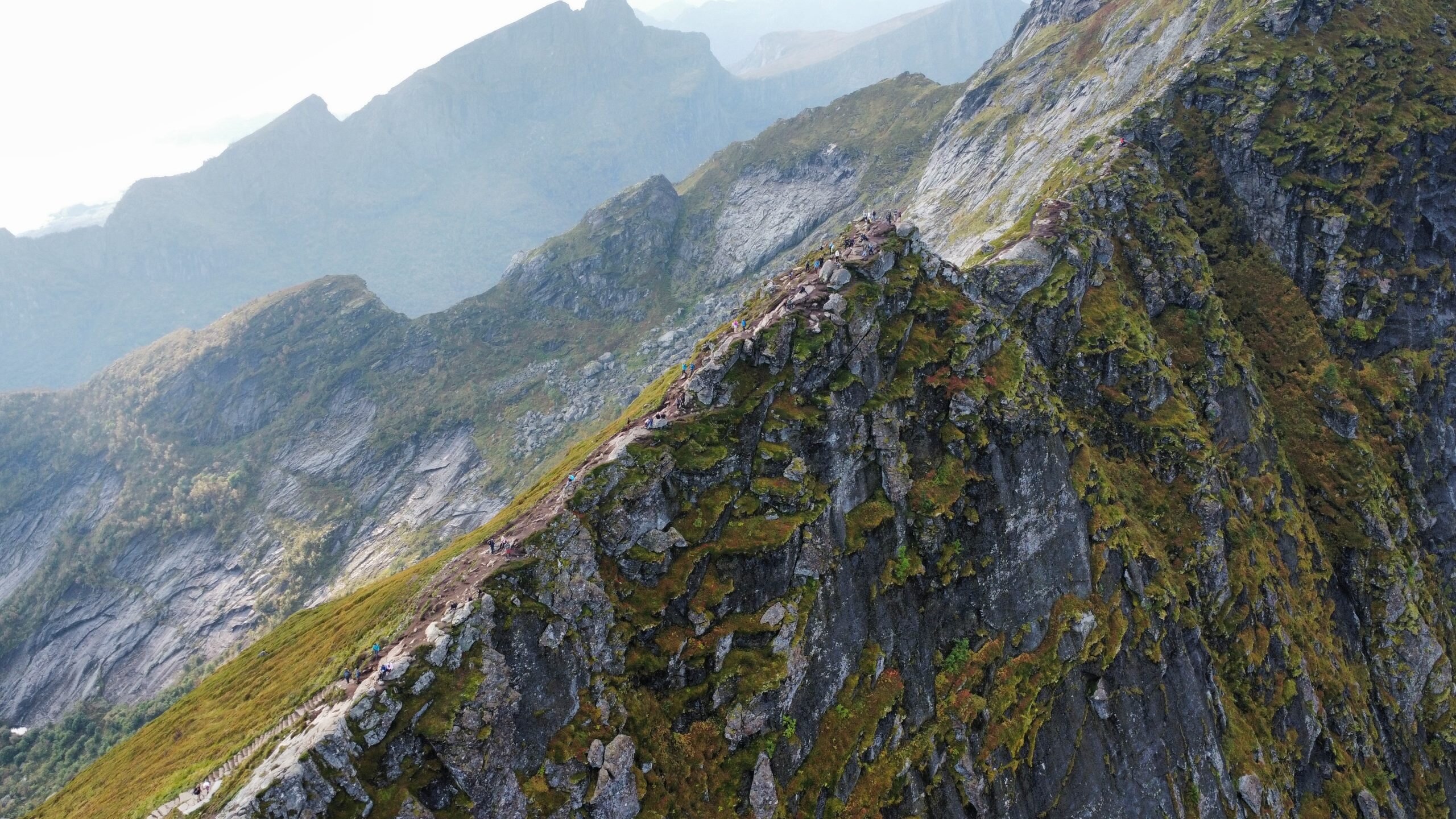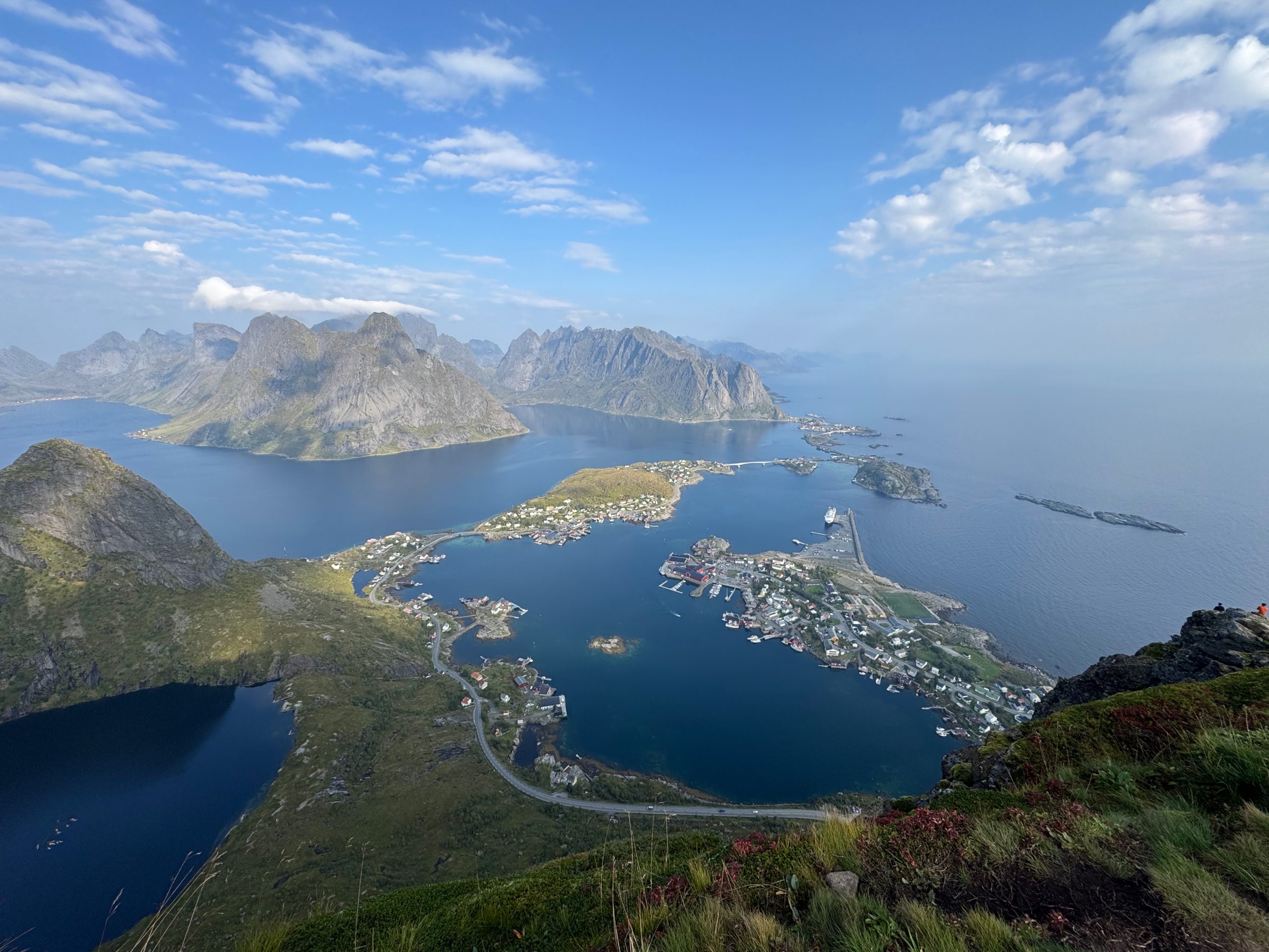 Am nächsten Tag standen wir früh auf und packten unsere Sachen, um eine der schönsten Wanderungen der Lofoten zu machen. Vom Parkplatz in Reine aus kann man loswandern, durch den Ort bis zum Startpunkt des Weges. Dort beginnt die Wanderung offiziell: 1 km nur bergauf mit 1978 Stufen und 448 m Höhenunterschied. Sie ist nicht sehr lang, aber die Tatsache, dass es durchgehend große Stufen sind, macht sie anstrengend. Aber die Belohnung oben ist die Mühe wert: ein atemberaubender Blick auf die Fjorde, Reine und die E10 mit ihren berühmten Brücken, die alle Inseln verbinden.