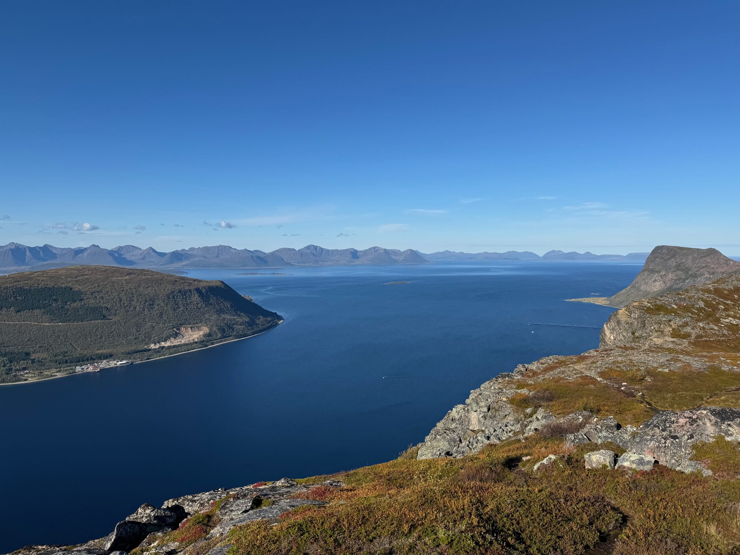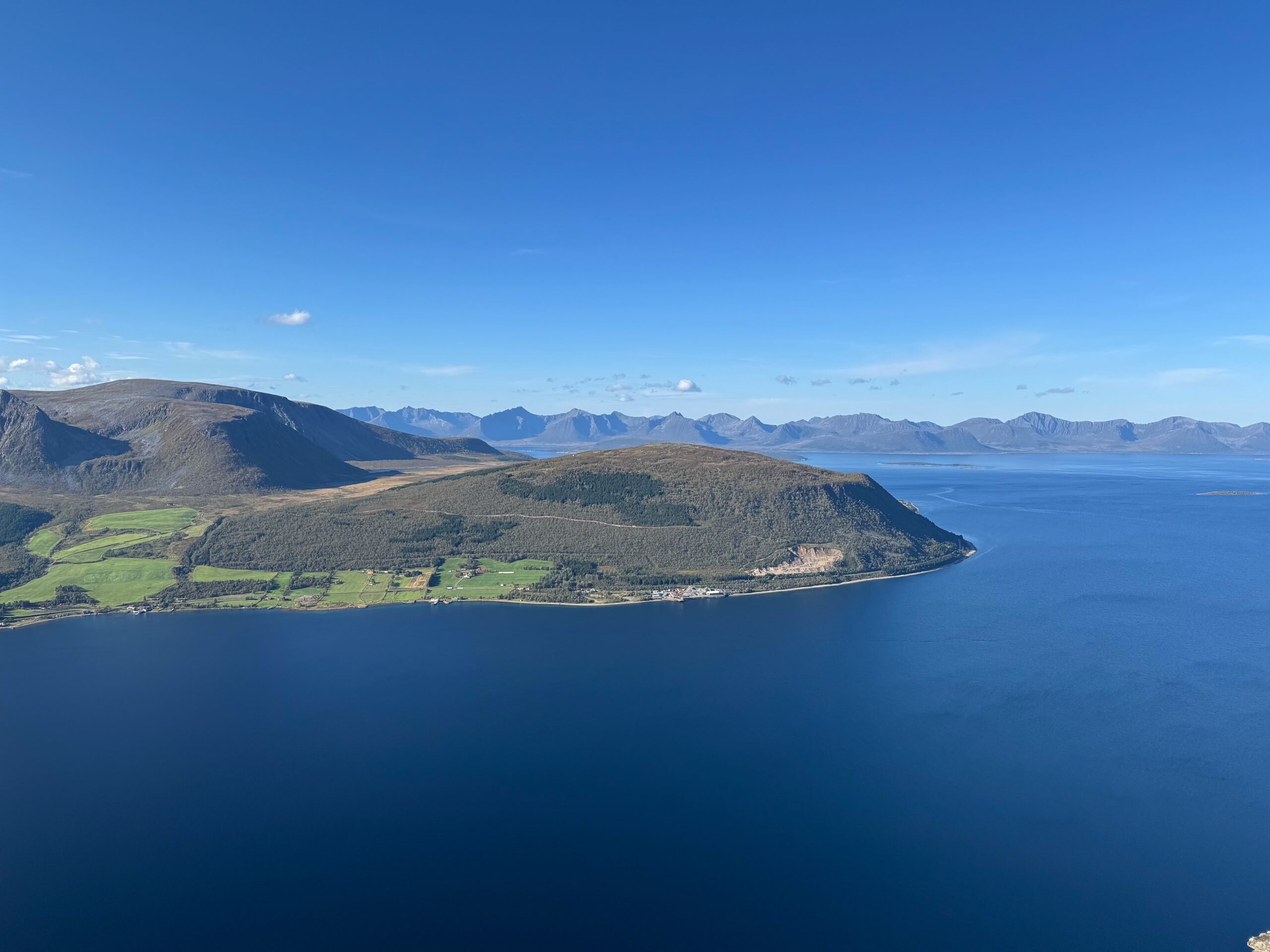 Nach einer wunderbaren Nacht in Elgsnes traten wir die Rückreise an. Es war unser letzter voller Tag mit dem Wohnmobil, da wir es am nächsten Morgen zurückgeben und den Flug nach Hause nehmen mussten. Wir nutzten die Gelegenheit, langsam zu fahren und die letzten Momente der Landschaft zu genießen. Wir hielten in Harstad an, um die Stadt zu besichtigen, am Hafen entlangzuschlendern und in einem lokalen Restaurant zu Mittag zu essen.