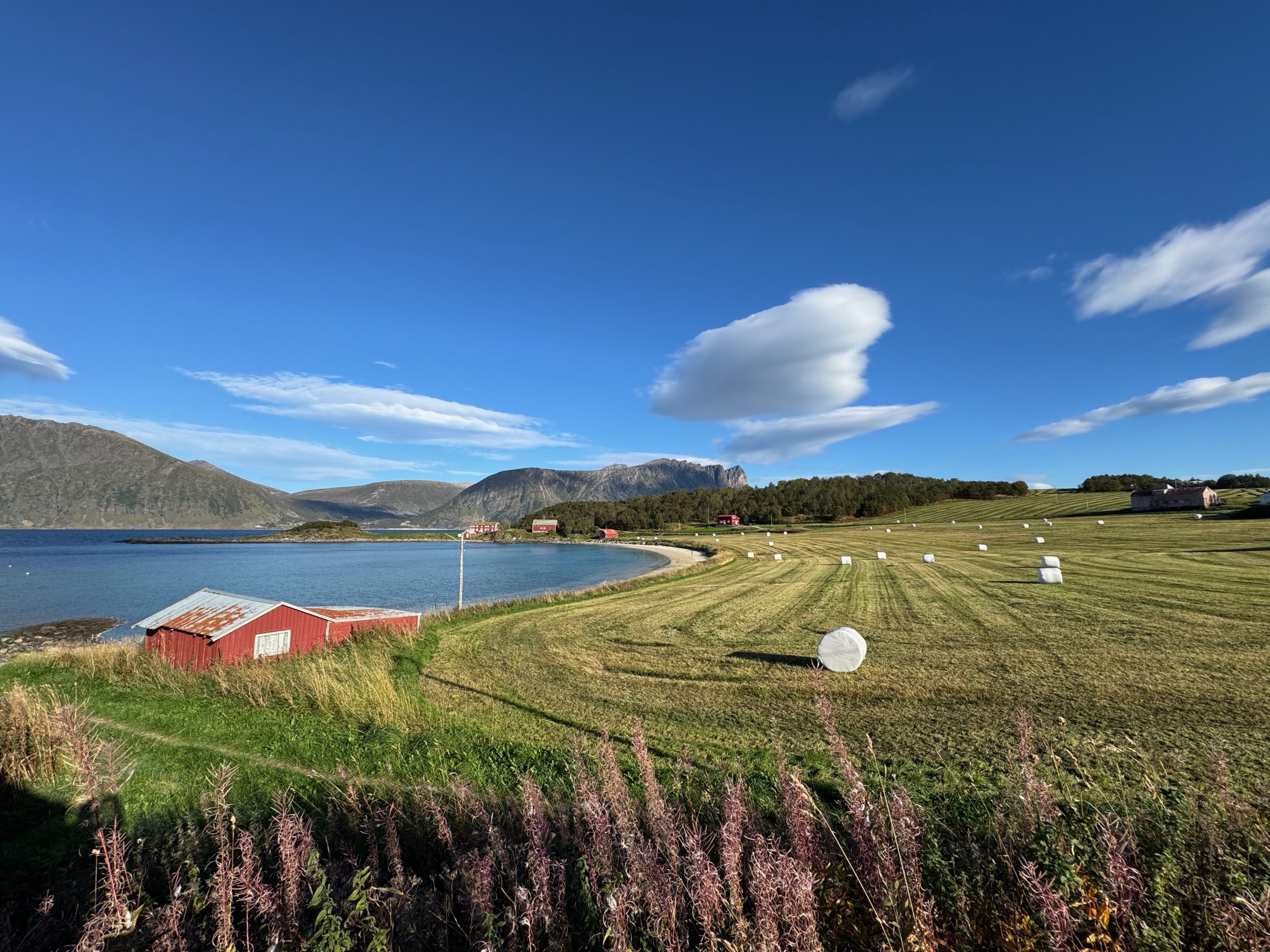 Dieses winzige Dorf heißt Elgsnes und besteht aus kaum mehr als 5 Häusern, einem Bauernhof, einem Strand und einer Kirche. Buchstäblich am Ende der Straße gibt es einen kleinen Platz, damit Fahrzeuge wenden können, und daneben ist Platz für ein paar Fahrzeuge. Da wir früh dran waren, hatten wir Glück, einen Platz zu finden, und entschieden uns, die Nacht dort zu verbringen. Den Rest des Tages genossen wir den Strand, beobachteten den Traktor beim Bestellen des Feldes neben dem Bauernhof und entspannten natürlich beim Sonnenuntergang.
