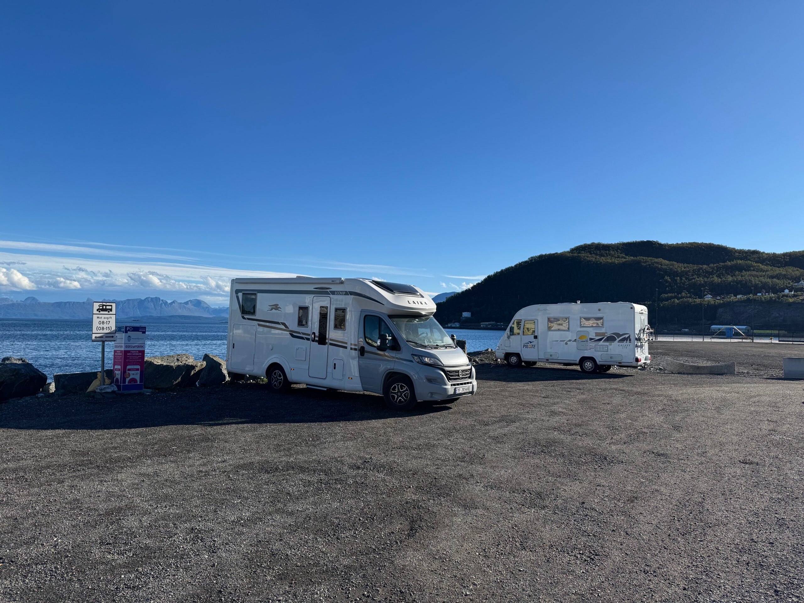 Es gibt einen guten Parkplatz mit Platz für Wohnmobile. Die Bezahlung erfolgt über die EasyPark-App und die Lage ist ideal, nah am Stadtzentrum und direkt am Meer.