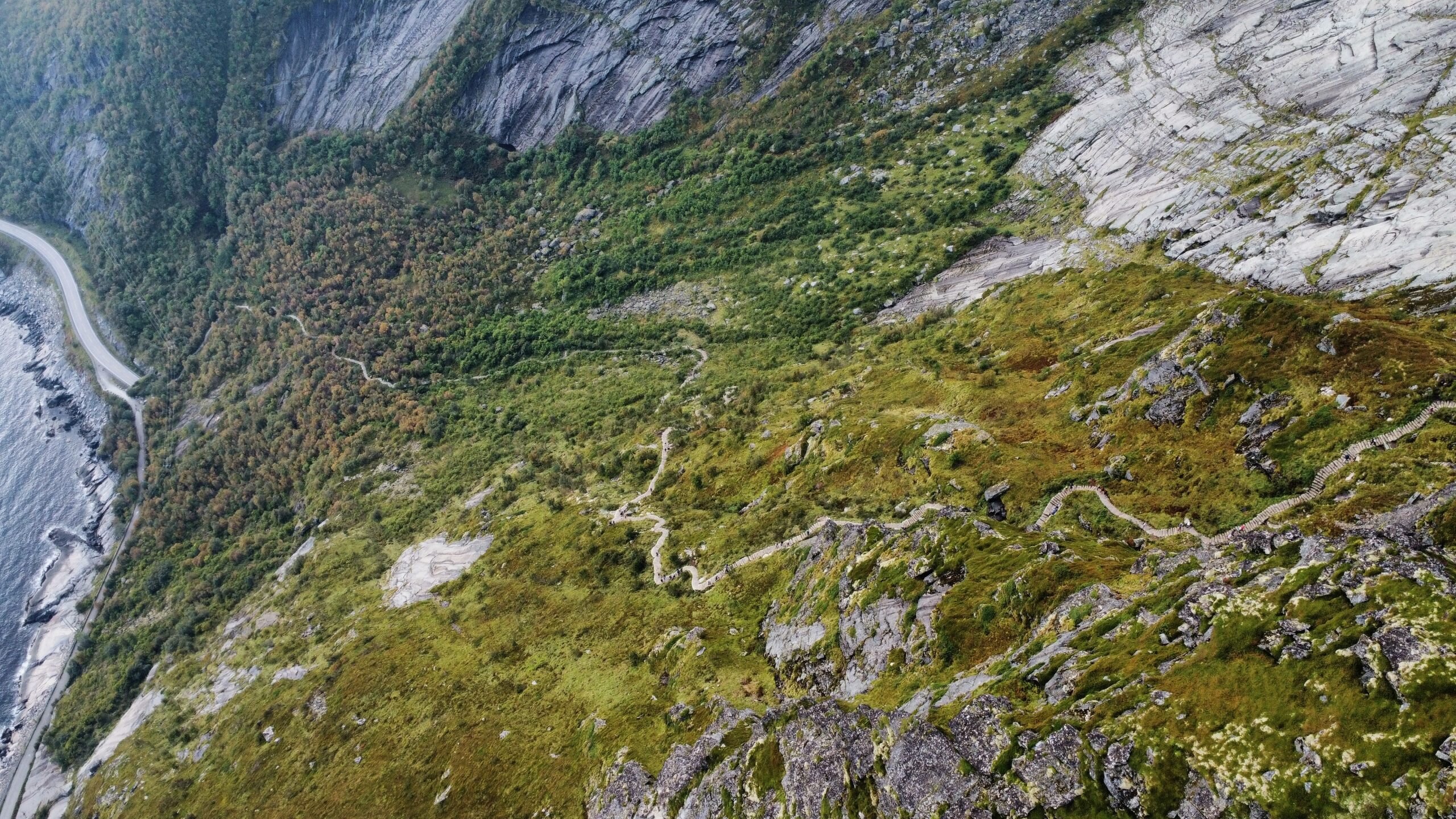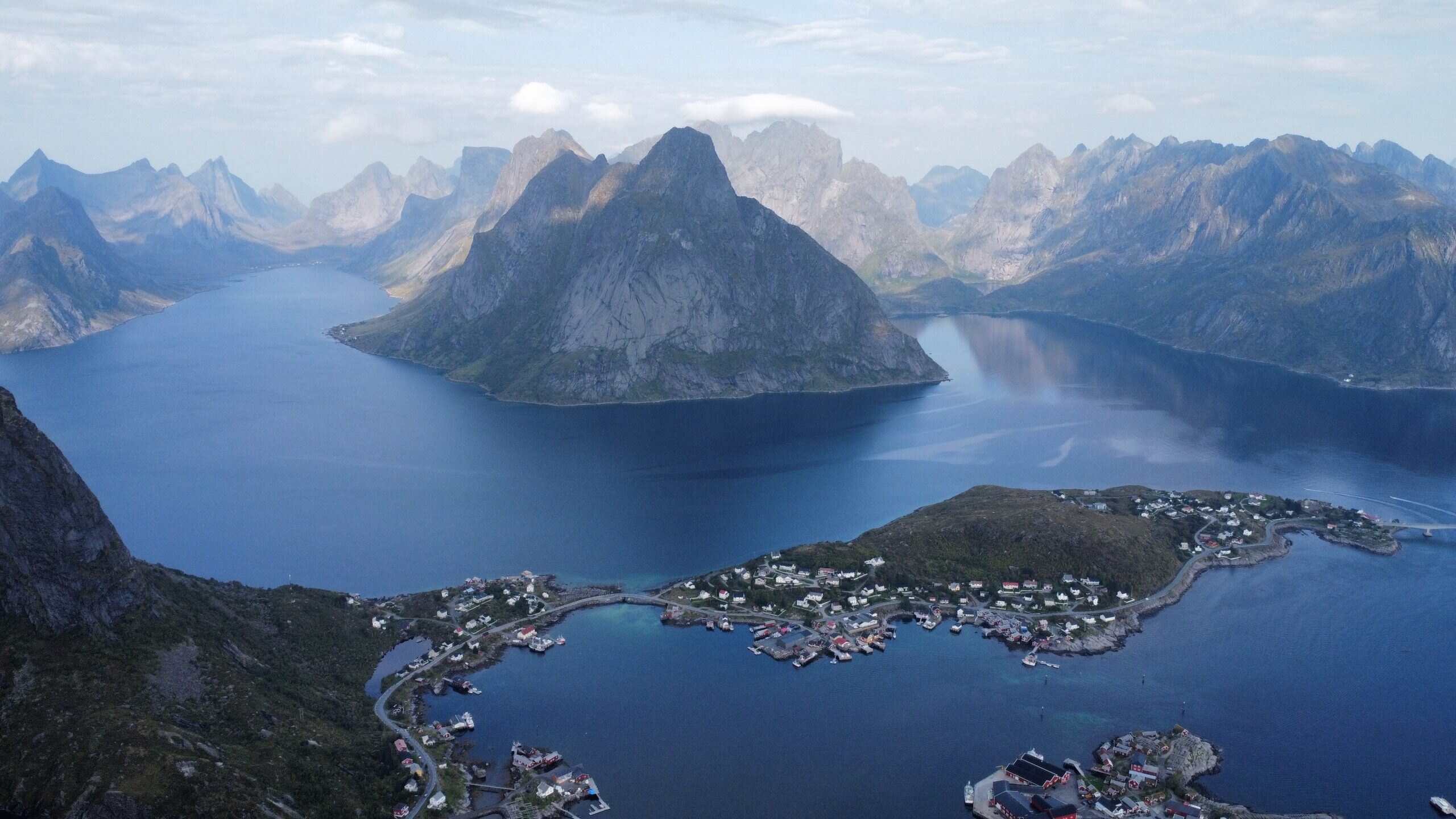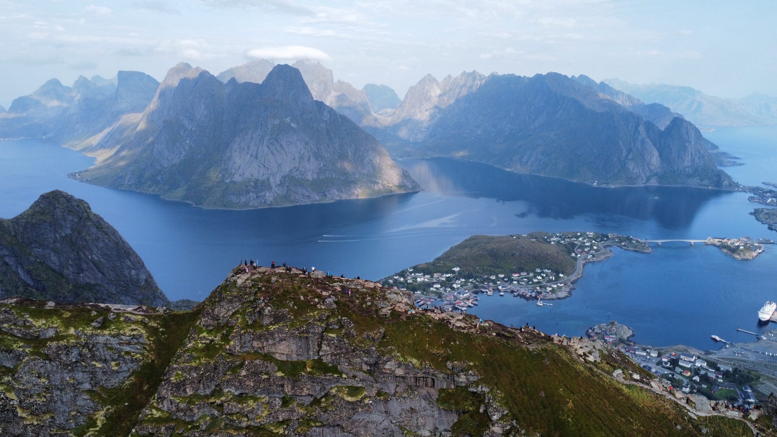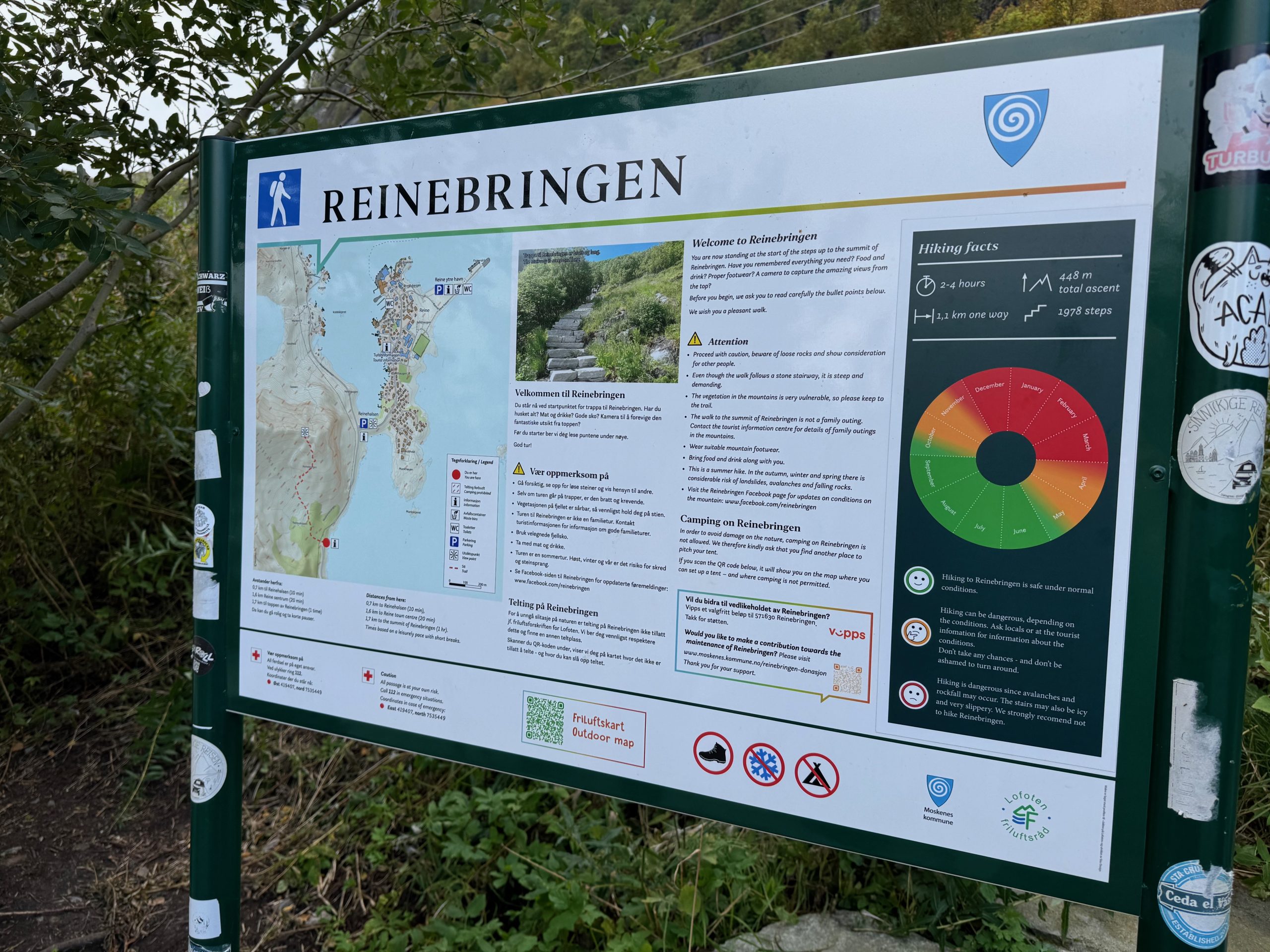 Am nächsten Tag standen wir früh auf und packten unsere Sachen, um eine der schönsten Wanderungen der Lofoten zu machen. Vom Parkplatz in Reine aus kann man loswandern, durch den Ort bis zum Startpunkt des Weges. Dort beginnt die Wanderung offiziell: 1 km nur bergauf mit 1978 Stufen und 448 m Höhenunterschied. Sie ist nicht sehr lang, aber die Tatsache, dass es durchgehend große Stufen sind, macht sie anstrengend. Aber die Belohnung oben ist die Mühe wert: ein atemberaubender Blick auf die Fjorde, Reine und die E10 mit ihren berühmten Brücken, die alle Inseln verbinden.
