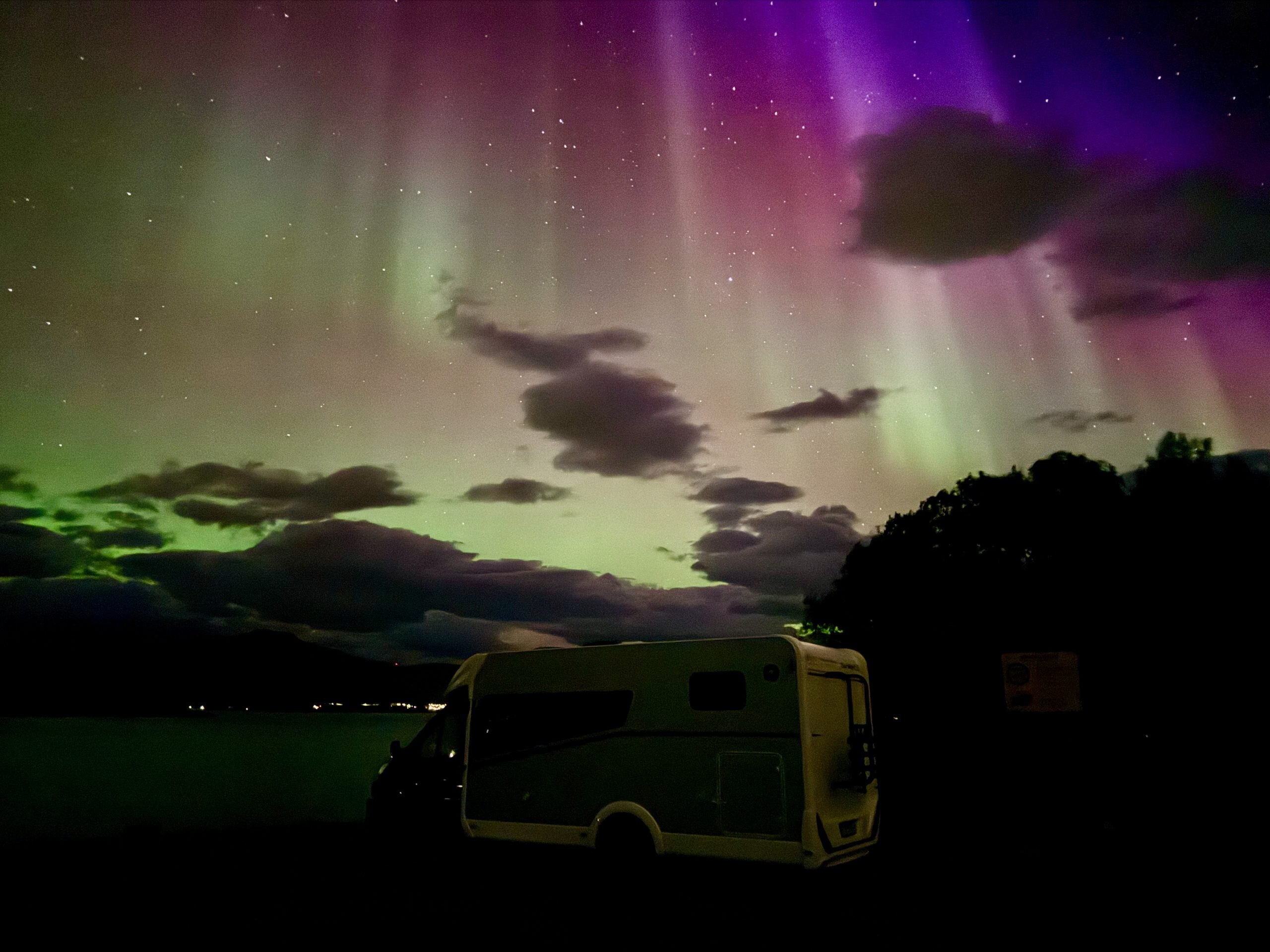 Wir hatten noch nicht über eines der Highlights Norwegens gesprochen, besonders im Polarkreis: die Nordlichter. Um sie sehen zu können, braucht man im Wesentlichen 3 Dinge: Dunkelheit, genügend Sonnenaktivität und einen klaren Himmel. Wir haben jeden Tag die Vorhersage gecheckt, aber die Sonnenaktivität war die ganze Zeit ziemlich niedrig. Aber in dieser Nacht standen die Sterne günstig! Es gab ein kleines Zeitfenster nach dem Abendessen, das dunkel genug war, mit Sonnenaktivität und ohne Wolken (die später kommen sollten). Also gingen wir, als es soweit war, aus dem Wohnmobil und nachdem wir uns an die Dunkelheit gewöhnt hatten, sahen wir sie zum ersten Mal in unserem Leben. Es war ein magischer Moment und das perfekte Ende unserer Reise zu den Lofoten.