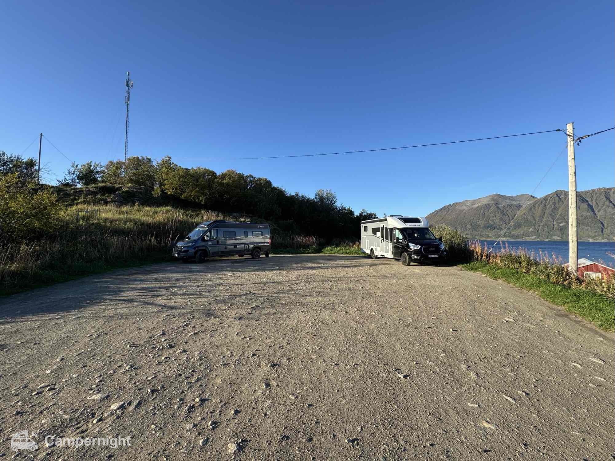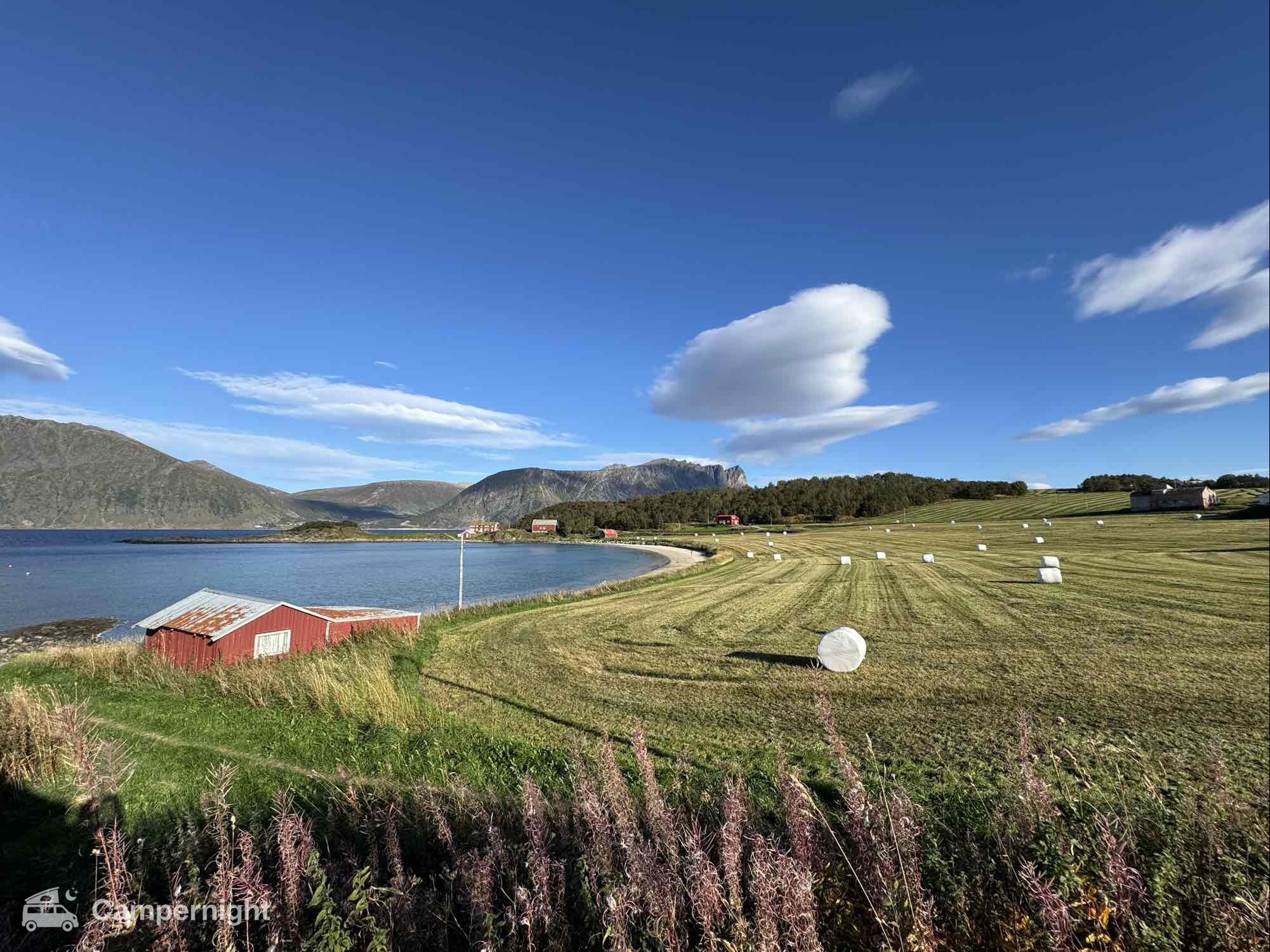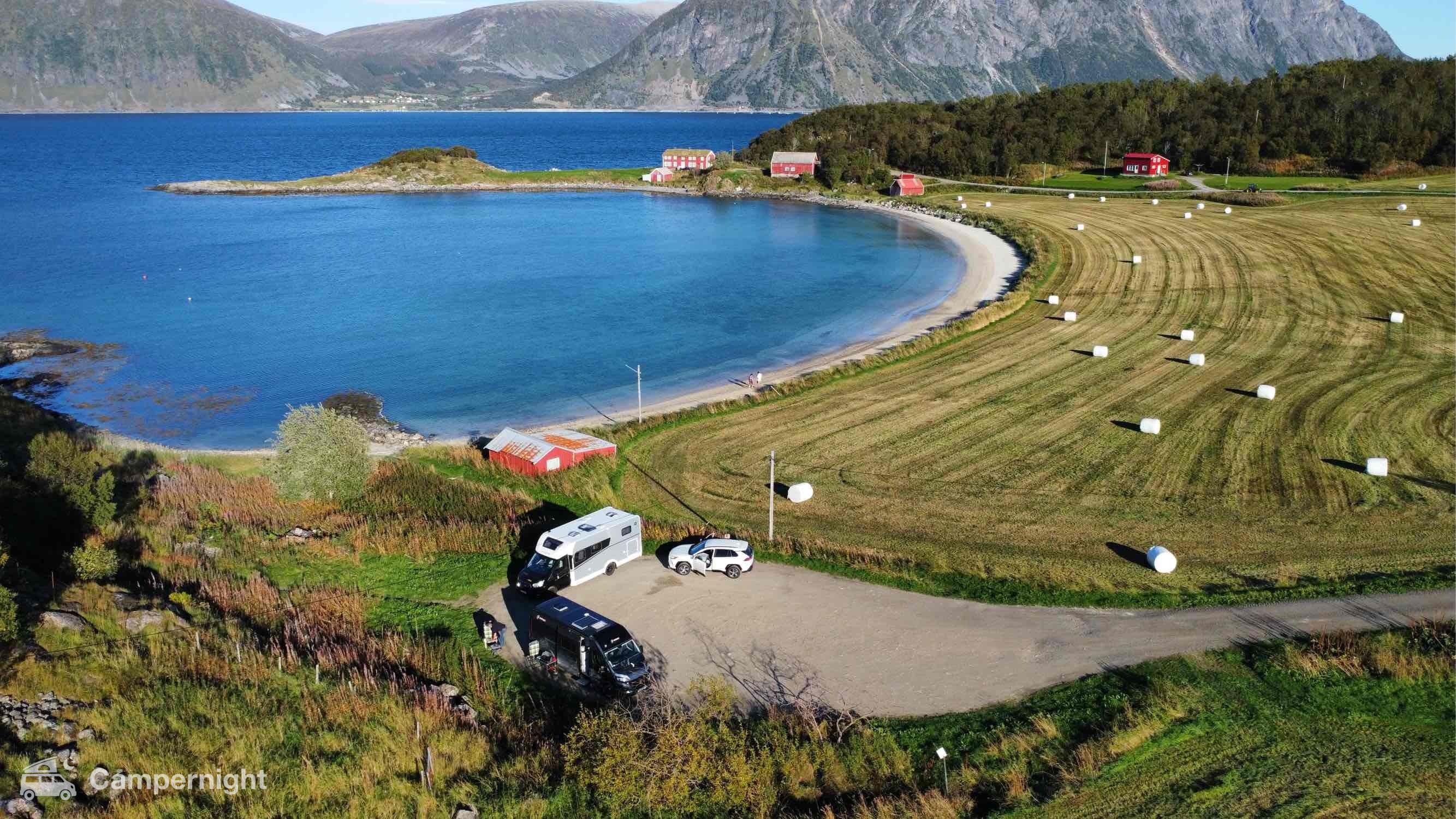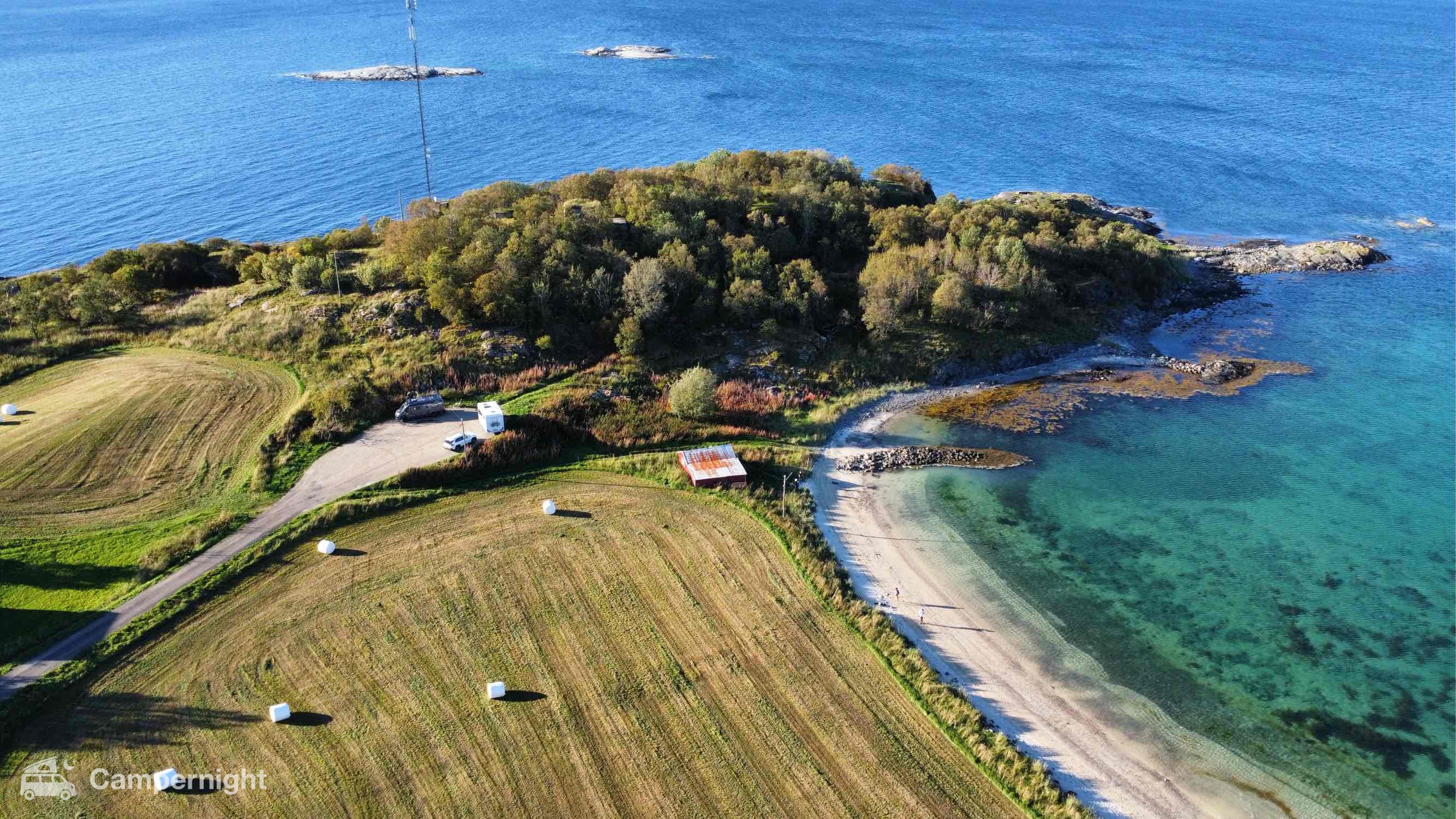 A hidden gem with astonishing views in a remote, calm area next to a beach and a farm. Simply beautiful. Space for 2-3 campers max. We could see northern lights đ
